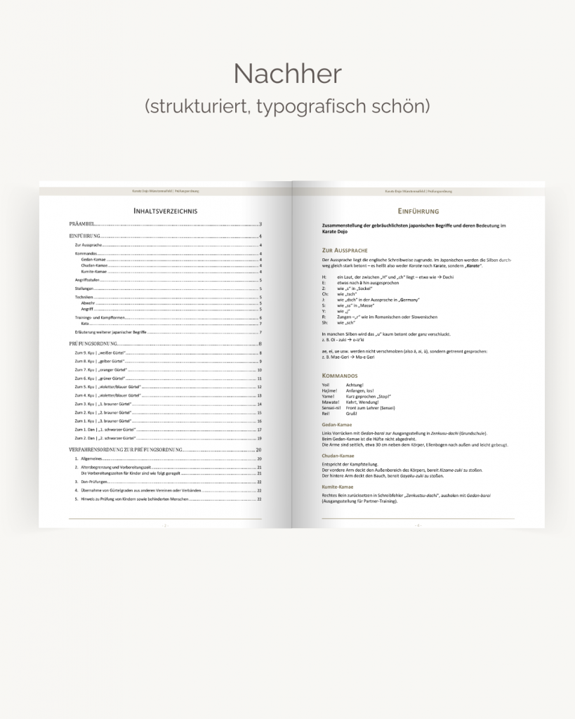 Bei mehrseitigen, umfangreichen Dokumenten ist eine Gliederung in Kapitel oder Themenabschnitte und ein Inhaltsverzeichnis sehr hilfreich.